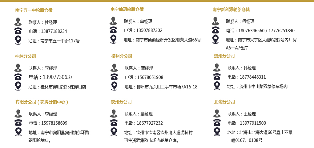 本公司是廣西區(qū)內(nèi)的輪胎批發(fā)及零售商,獨(dú)家代理世界及國(guó)內(nèi)眾多知名品牌輪胎:德國(guó)大陸馬牌輪胎(世界第四品牌),美國(guó)庫(kù)珀輪胎(世界第八品牌)杭州中策朝陽(yáng)(中國(guó)第一品牌),杭州中策好運(yùn)(中國(guó)第二品牌),無(wú)錫紅豆、赤兔馬、千里馬,等品牌。在廣西區(qū)內(nèi)有眾多集團(tuán)客戶(hù),主要為中國(guó)鋁業(yè)股份有限公司平果分公司、廣西晟宇通物流有限公司、南寧市平樂(lè)行物流有限公司、柳州恒達(dá)巴士股份有限公司、廣西欽州國(guó)際集裝箱碼頭有限公司、廣西盛達(dá)混凝土有限公司、火車(chē)站物流車(chē)隊(duì)、區(qū)內(nèi)部分快運(yùn)車(chē)隊(duì)等的輪胎專(zhuān)用供應(yīng)商。多年以來(lái),被南寧市工商局授予“誠(chéng)信?維權(quán)承諾單位”、“消費(fèi)者信得過(guò)單位”以及“南寧市第一次全國(guó)經(jīng)濟(jì)普查先進(jìn)集體單位”。